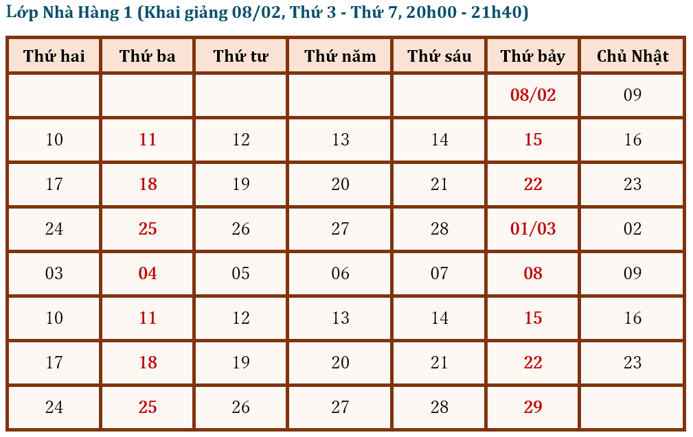 Lịch học lớp Nhà Hàng
