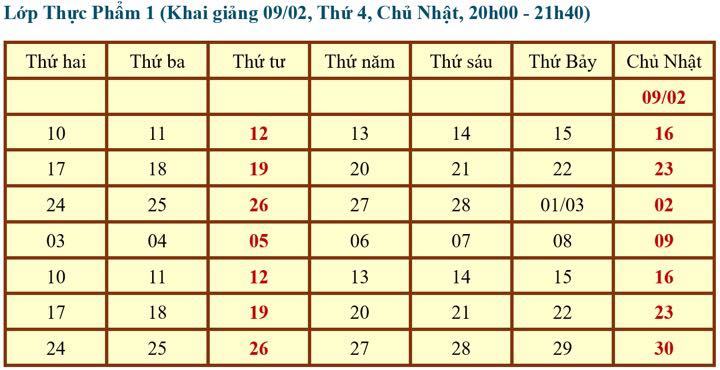 Lịch học lớp Thực Phẩm